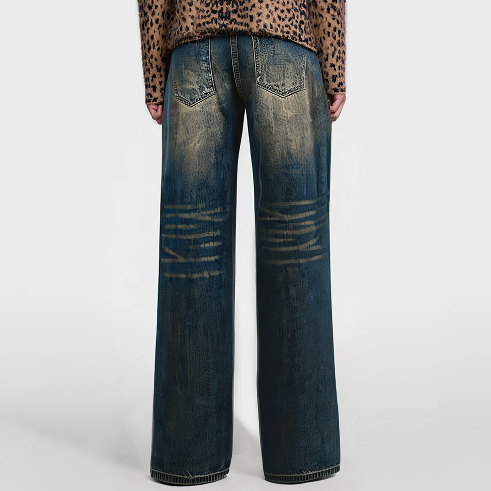 The jeans undergo a wash and distressing process to create a natural vintage fade and unique aged effect, enhancing visual depth and making each pair uniquely charming. The design remains clean and minimalist, eliminating unnecessary embellishments, with subtle pleated details that add a touch of sophistication.