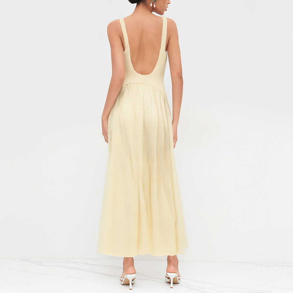 The design highlights include a sleeveless, open-back cut that naturally highlights the shoulders, neckline, and back, adding a touch of femininity and sensuality. The crown-shaped waistline design precisely cinches the waist, creating a flattering silhouette. The skirt features pleated detailing, adding layers and a flowing feel, giving the overall look a sense of lightness and elegance.