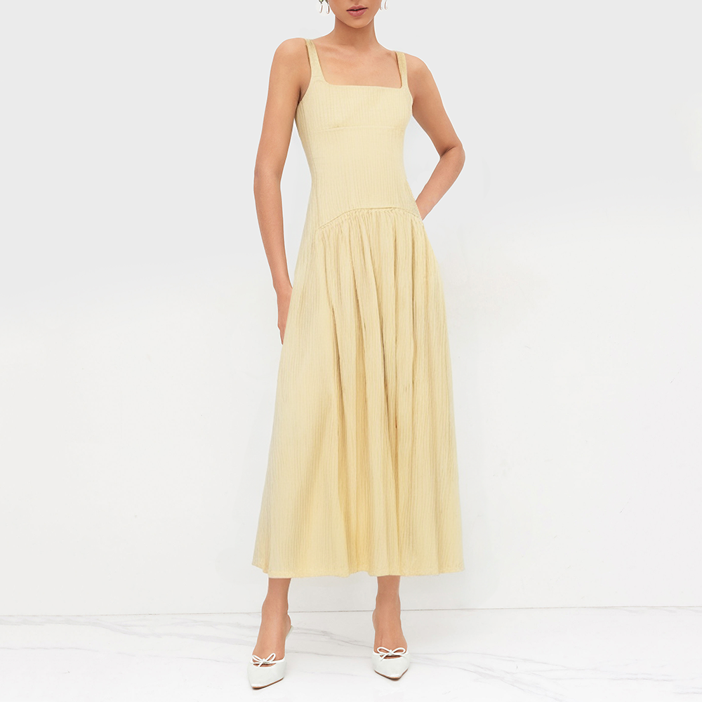 This long dress combines minimalist design with a vacation-inspired style, showcasing the elegance and effortless charm of women. The dress is made from a woven polyester fabric, which is lightweight, breathable, and has a soft, smooth texture. It is also machine-washable, ensuring comfort and ease of care for everyday use.