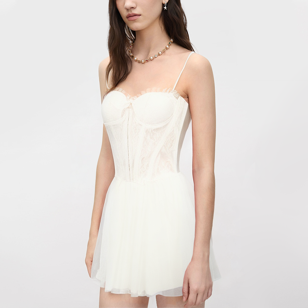 In terms of design, the dress features sleeveless straps and a crown-shaped waistline that naturally hugs the body, accentuating the waistline and highlighting the woman's beautiful proportions. The skirt is adorned with delicate lace embroidery, adding a touch of retro romance and depth, making the overall look simple yet full of detail. The mini skirt length effortlessly showcases youthful vitality and elegance.