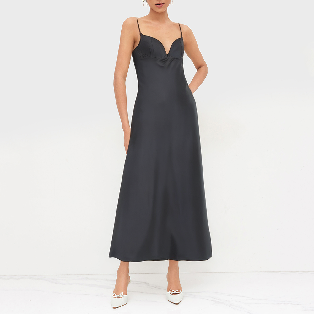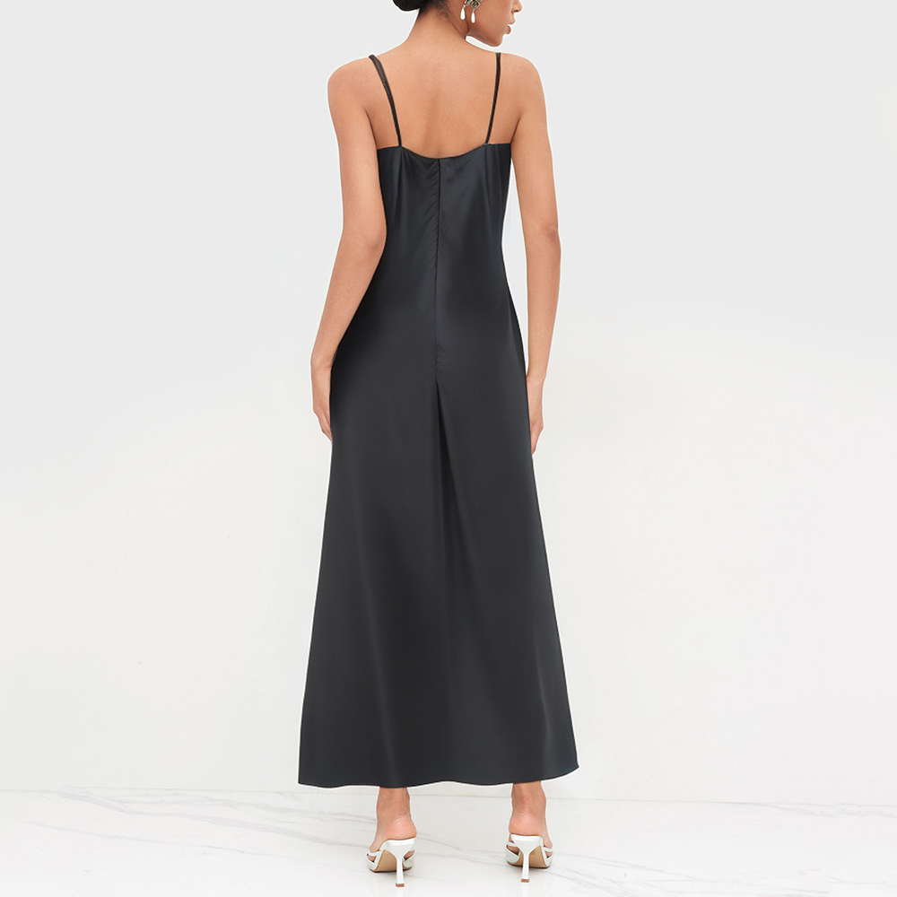 This long dress seamlessly blends retro style with modern casual elegance, embodying the feminine qualities of lightness, grace, and comfort. The dress is crafted from a satin-finished polyester fabric, featuring a smooth, lustrous texture that is lightweight, breathable, and comfortable to wear, while also being easy to care for in daily use.