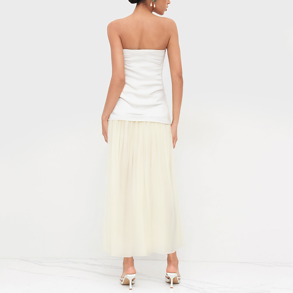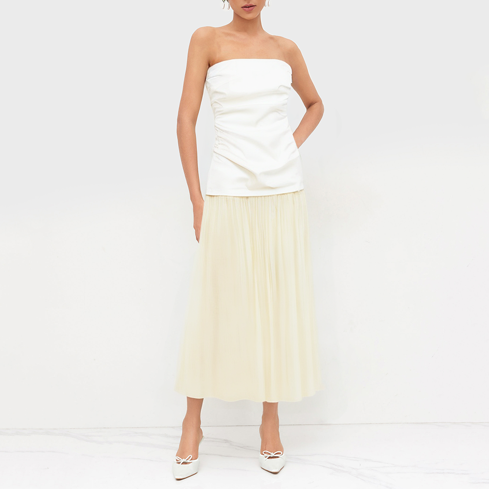 The design highlights include a collarless, sleeveless top cut that naturally highlights the shoulders, neck, and arm lines, emphasizing the feminine upper body silhouette. The crown-shaped waistline design precisely cinches the waist, creating a flattering body proportion. The skirt's paneled construction and pleated decorations add depth and movement, while the hidden zipper ensures easy on/off while maintaining the skirt's smooth silhouette.