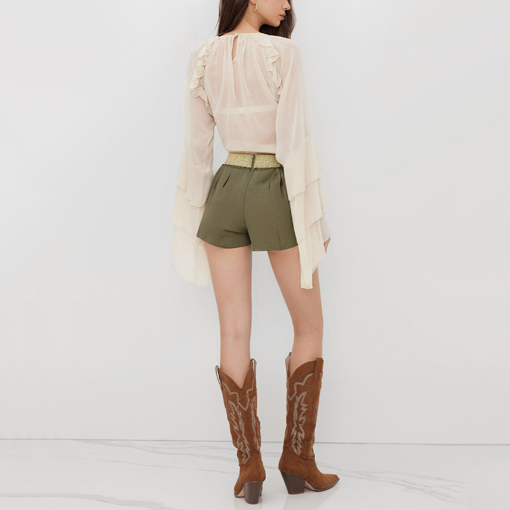 These shorts feature a high-waisted design that perfectly accentuates the waistline, elongates the legs, and exudes elegance and sensuality. Crafted from a premium satin-finished linen blend fabric, they are lightweight, breathable, eco-friendly, and comfortable—ideal for summer wear.