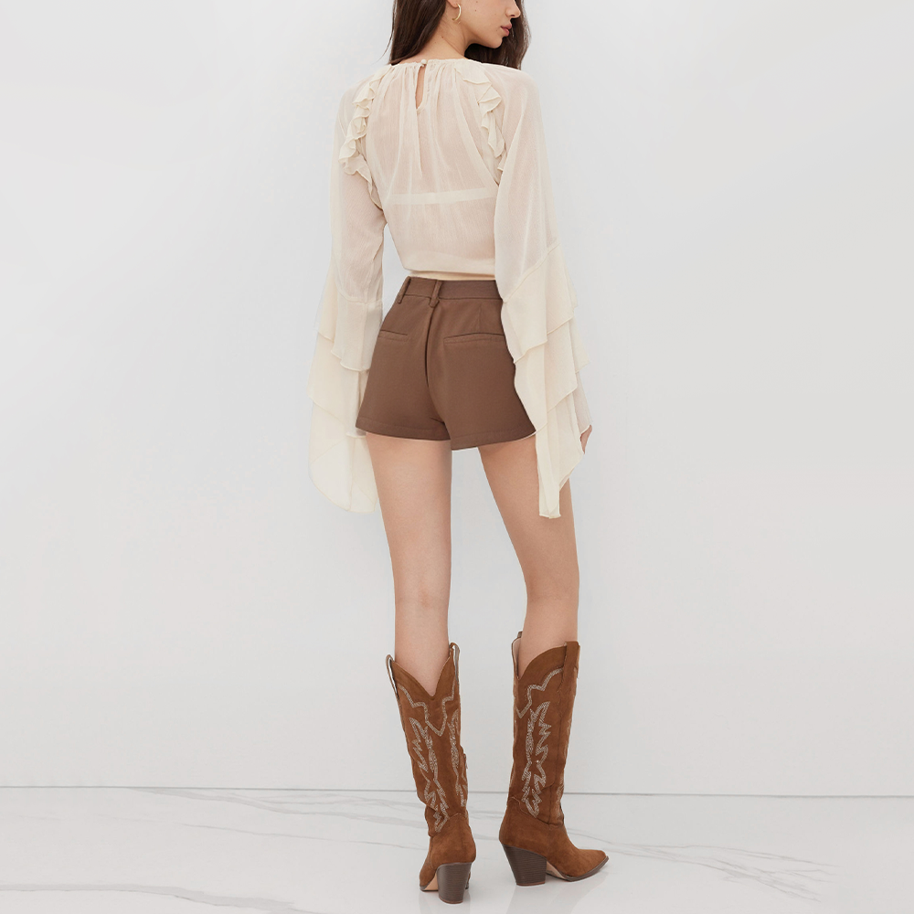 These shorts are crafted from a premium blended fabric using a meticulous dyeing process, seamlessly blending a natural vintage texture with modern fashion sensibilities. The high-waisted design naturally accentuates the waistline, enhancing overall body proportions and creating an elegant, elongated visual effect.
