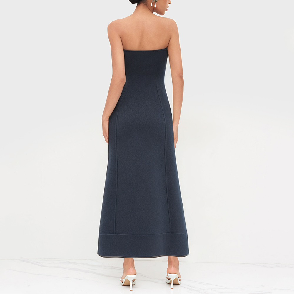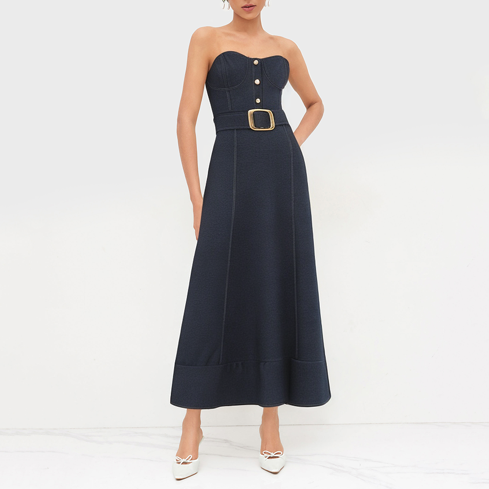 The design highlights include a sleeveless, collarless cut that naturally highlights the shoulder and neckline, adding a touch of feminine grace. The tube-style skirt design and waistband decoration effortlessly enhance body proportions, creating a sleek, elongated silhouette. The hidden zipper design ensures easy on/off while maintaining a clean, streamlined skirt shape. The overall style combines a classic minimalist design with retro elements, making it suitable for everyday wear as well as casual gatherings or vacation settings where it stands out elegantly.
