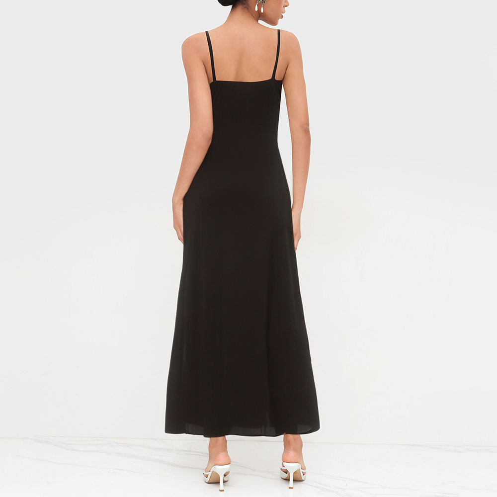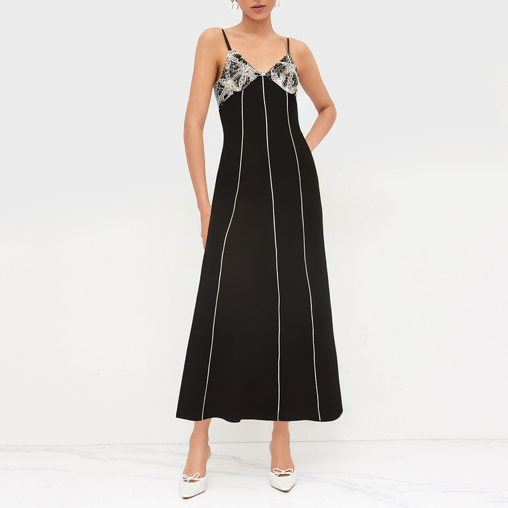 The design highlights include a retro spaghetti strap and V-neckline, which naturally accentuate the shoulder and neckline, elongating the neckline and adding a touch of feminine grace. Delicate embroidery details enhance the overall quality, giving the dress a more refined feel on a minimalist base. The side zipper design makes it easy to put on and take off while ensuring a smooth silhouette and flattering body contours. The overall design is simple yet detailed, suitable for various occasions.