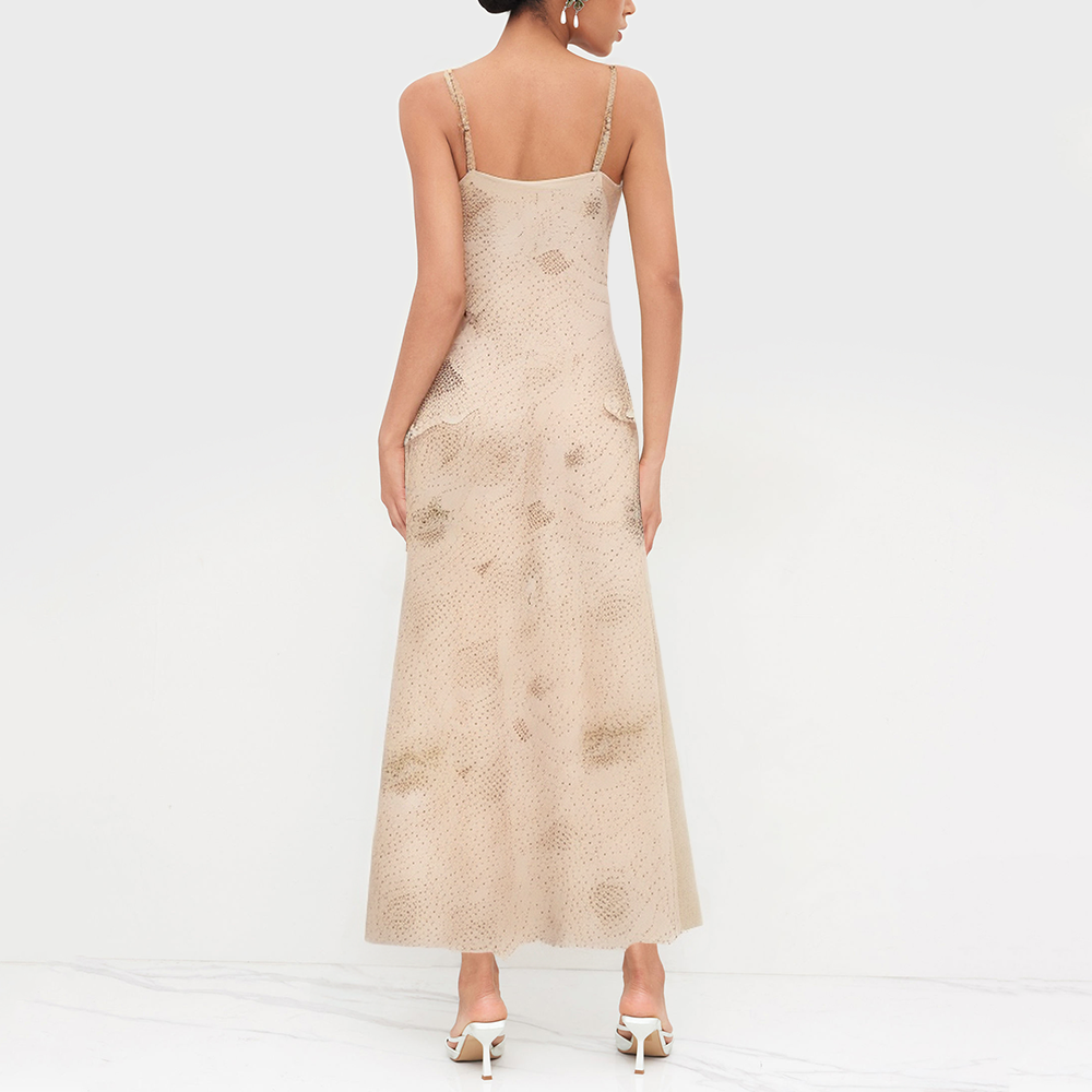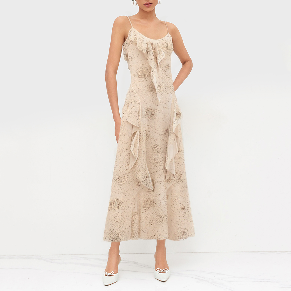 The layered skirt adds dimension and flow, creating an effortlessly elegant look. The vintage-inspired halter cut naturally accentuates the shoulders, neck, and arms, adding a feminine touch. The delicate beading on the skirt adds a touch of elegance, making the wearer stand out in everyday wear or special occasions. The overall style is a basic, minimalist style with vintage elements, creating a modern and elegant look.
