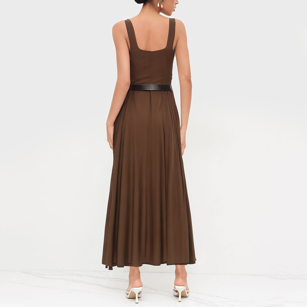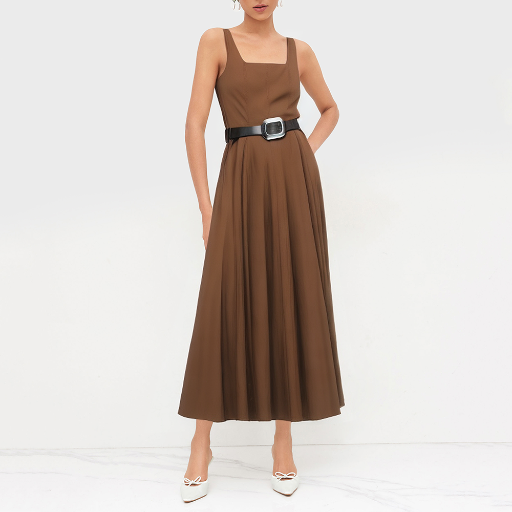 Design highlights include a belted waist and an invisible zipper, accentuating the waistline while maintaining a slim-fitting silhouette. The sleeveless cut showcases the shoulder lines, while the fitted silhouette emphasizes the beauty of the female form. The overall style blends retro elements with a classic minimalist design, making it suitable for various occasions.