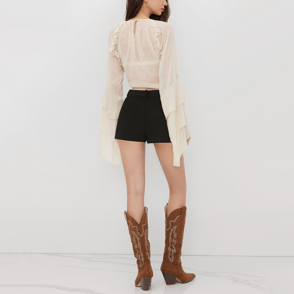 The shorts feature a regular fit with an A-line cut, effortlessly creating a natural drape. They blend vintage style with modern minimalism, offering a sleek and versatile design that pairs well with any outfit. No additional embellishments are needed to showcase their fashionable and refined appeal. The woven construction ensures durability and washability while maintaining a soft, comfortable feel, providing a natural and comfortable wearing experience.
