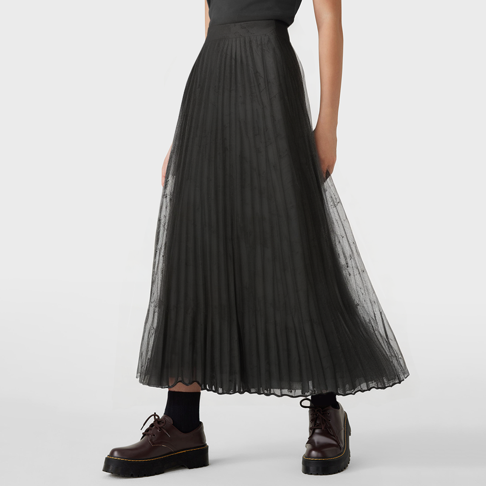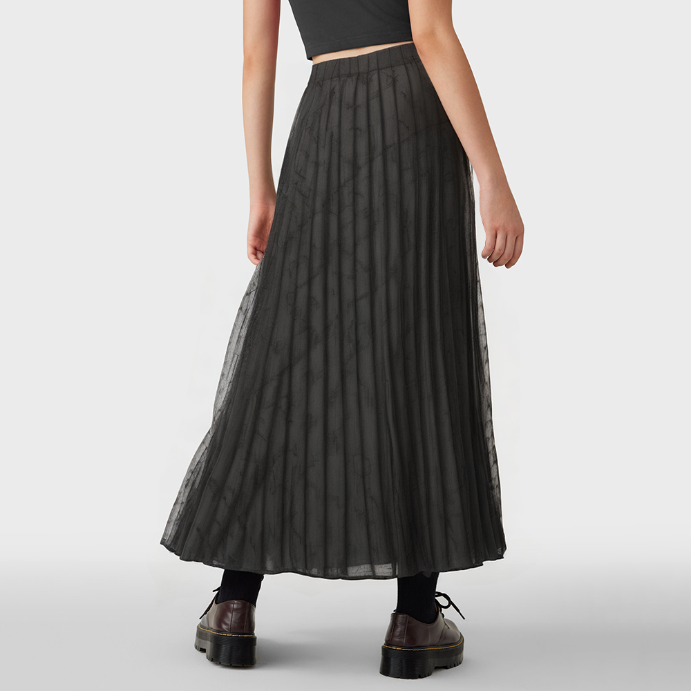 This skirt is crafted from high-quality polyester fabric using a pleating technique, resulting in a soft, breathable, eco-friendly, and durable material that is comfortable to wear and easy to maintain. The high-waisted elastic design follows the natural waistline, combining comfort with a slimming effect, allowing the wearer to effortlessly showcase an elegant silhouette. The delicate burnout print paired with a pleated skirt hem adds depth and movement, giving the overall look a vintage-inspired elegance while exuding feminine grace.
