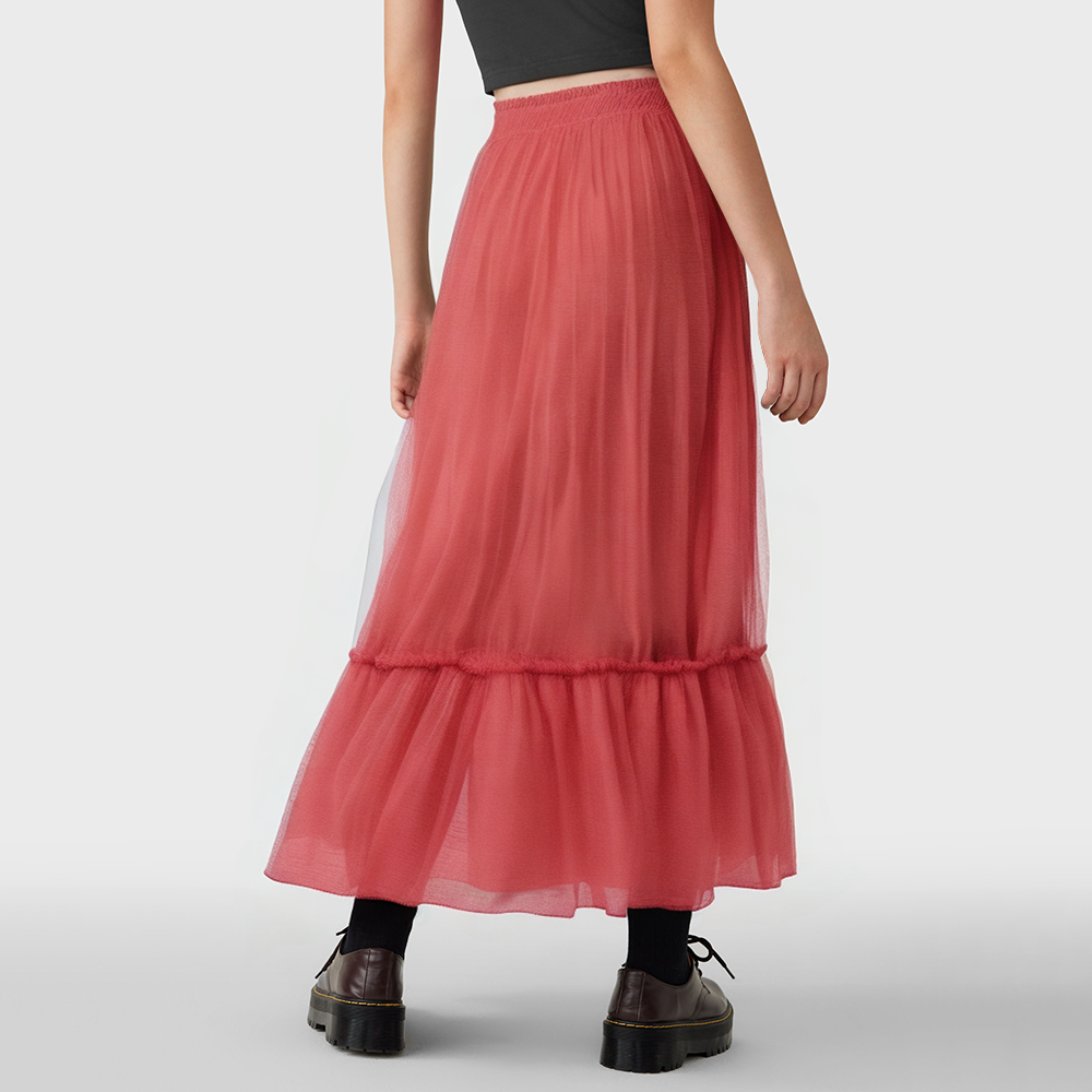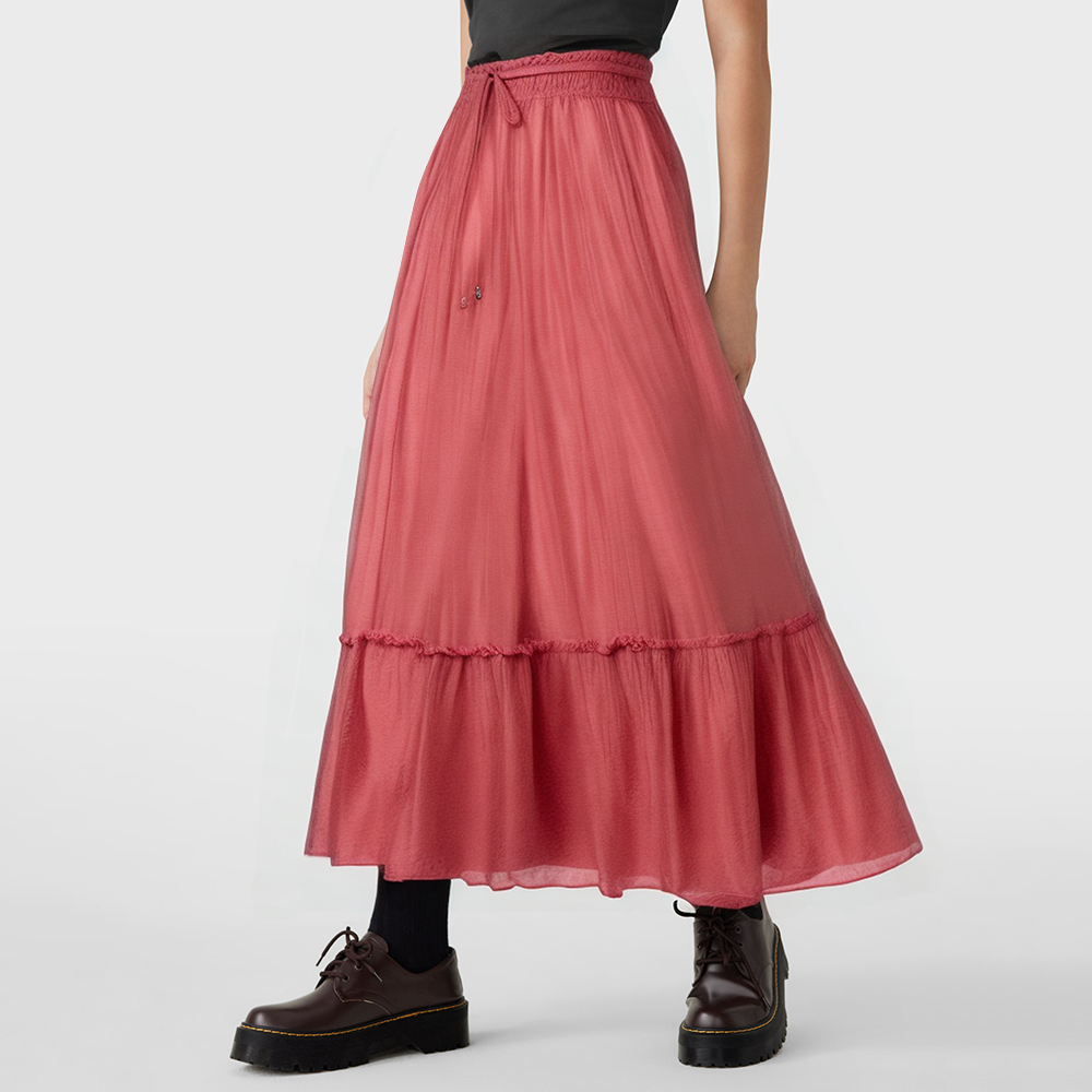 The skirt features pleated detailing and a flute-shaped silhouette, with a naturally flowing hem that adds a touch of retro elegance. The woven construction ensures the skirt maintains its structure while remaining soft to the touch, creating a comfortable yet layered look. The classic design pairs effortlessly with various tops and footwear, making it suitable for a variety of casual and everyday occasions.