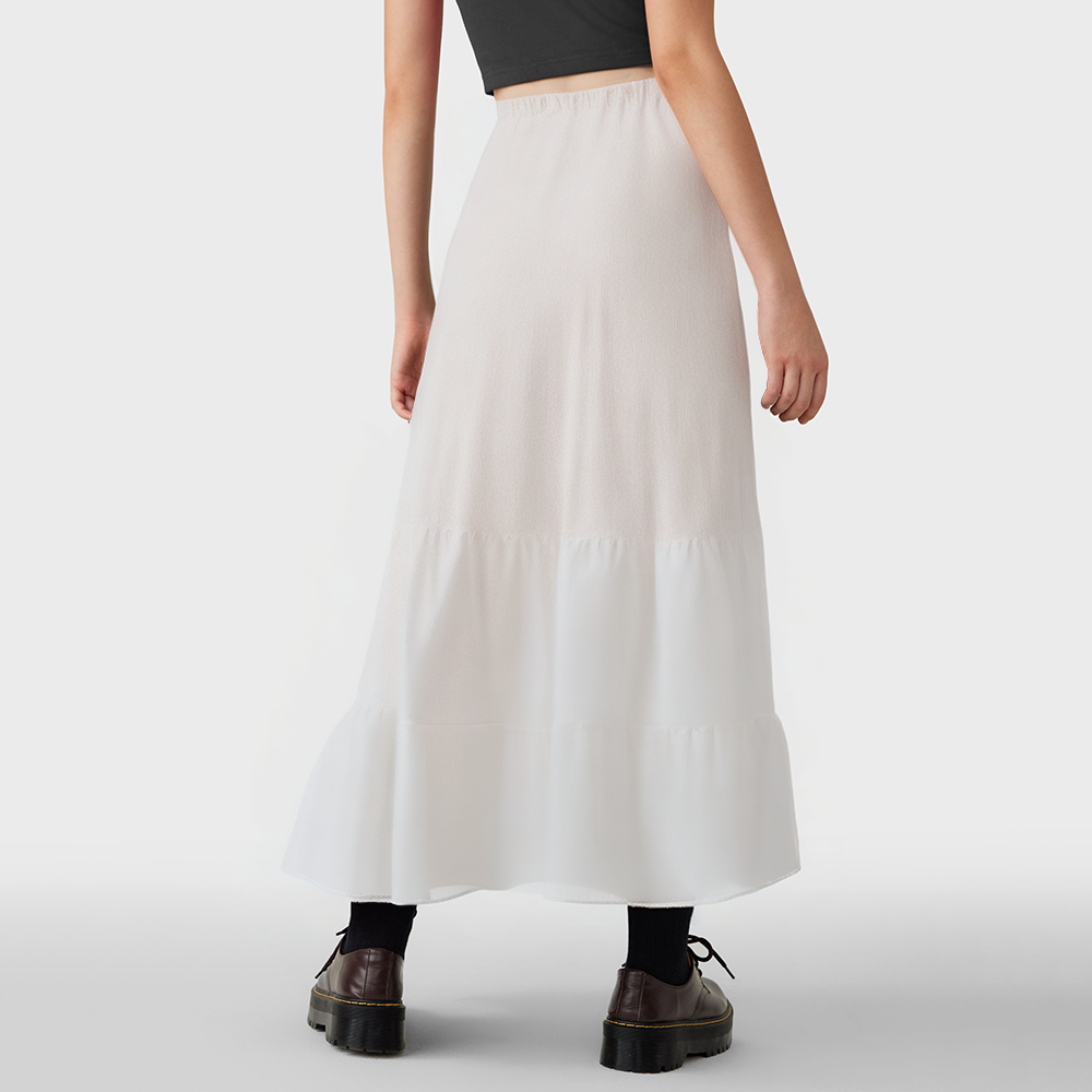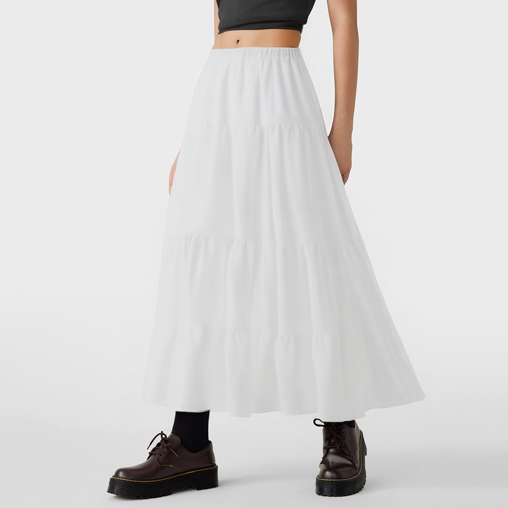 The skirt features a tiered design with layered ruffles, creating a three-dimensional effect and a light, flowing feel, blending retro charm with modern style. The woven construction ensures the skirt maintains its shape while remaining soft to the touch, offering a natural and comfortable wearing experience. The solid-color design is simple and versatile, easily paired with various tops and footwear, suitable for a variety of daily and casual occasions.