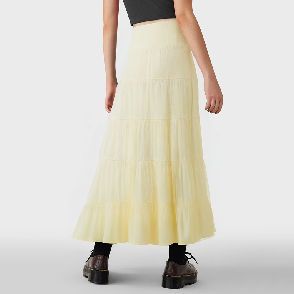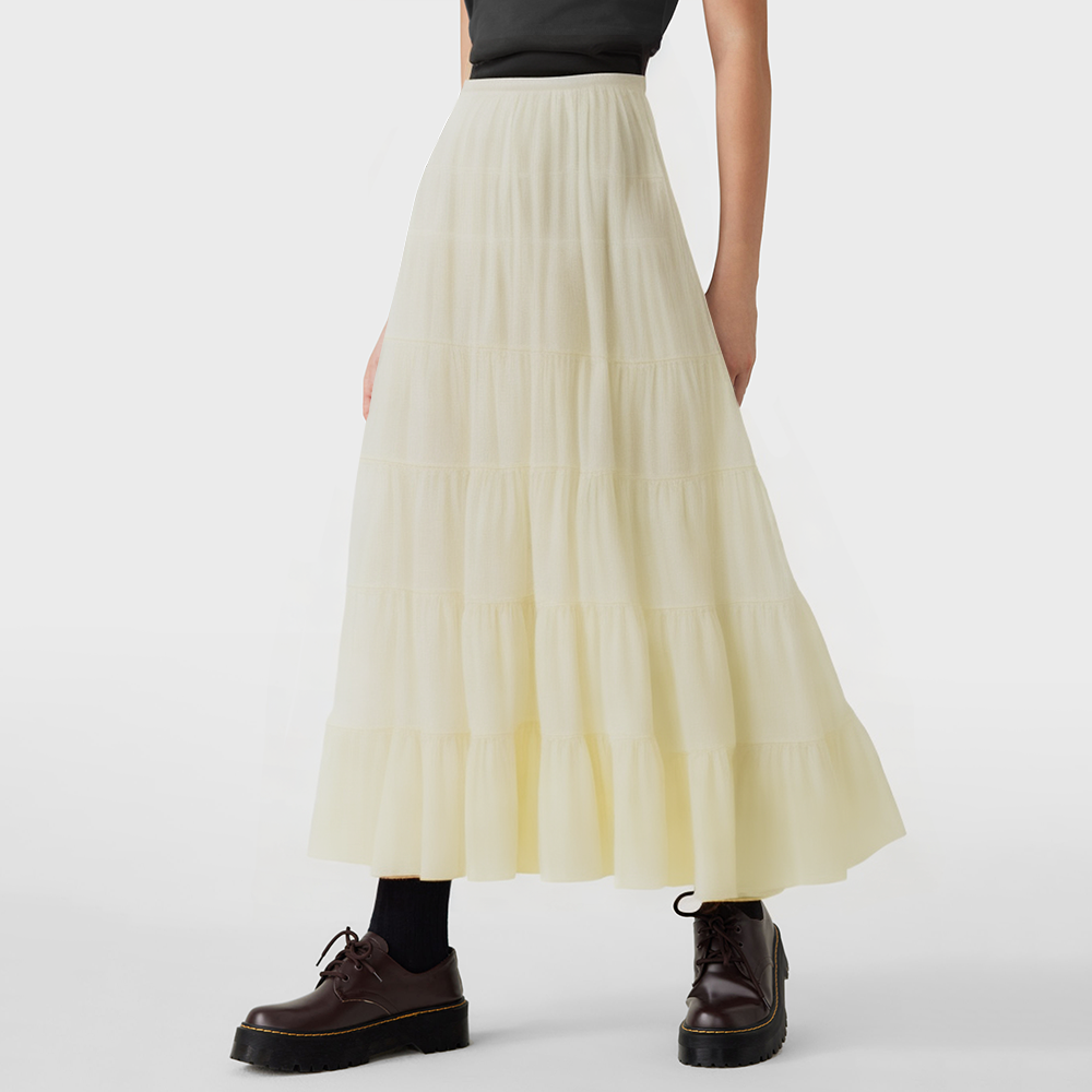 The skirt features layered panels and pleats, creating a rich textured look that is both retro and modern, blending casual and sensual elements. The woven construction ensures the skirt is durable yet maintains a soft feel, offering a comfortable and natural wearing experience. The simple, versatile design pairs effortlessly with various tops and footwear, making it an ideal choice for everyday casual wear and multiple occasions.