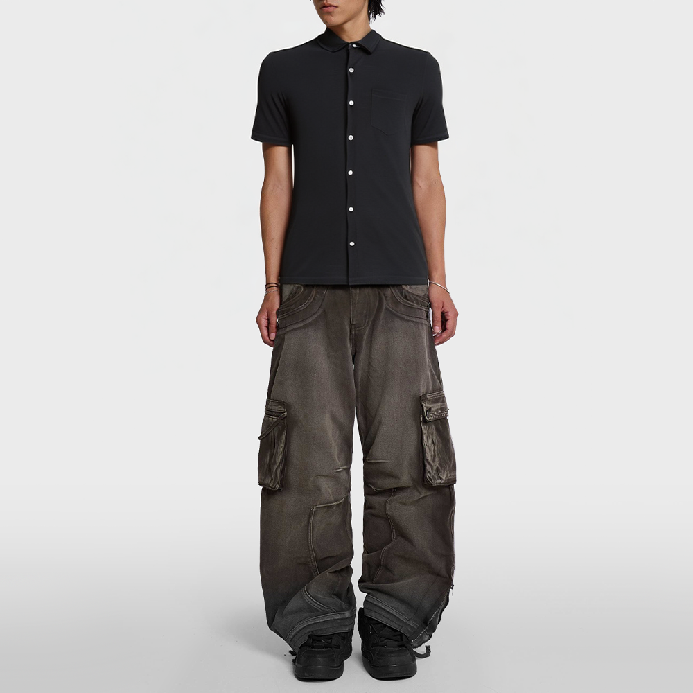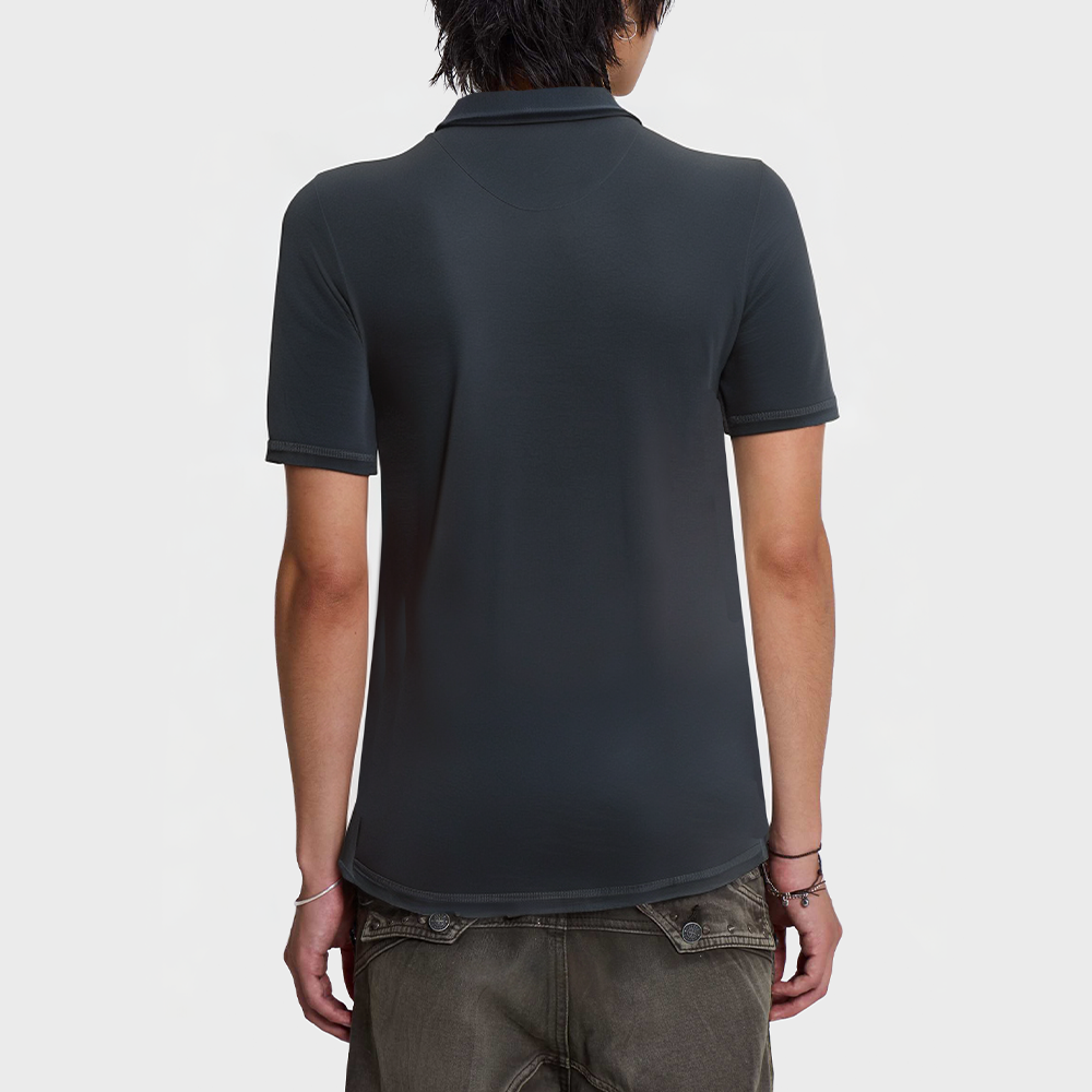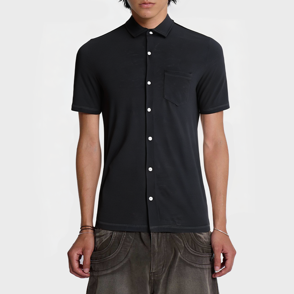 This short-sleeve shirt is crafted from high-quality jersey-knit wool fabric, offering softness, comfort, and excellent breathability. It hugs the skin while providing natural freedom of movement. The classic short-sleeve design combines with standard sleeve length, paired with a polo-style buttoned collar, creating a simple yet elegant look that is easy to put on and take off.
