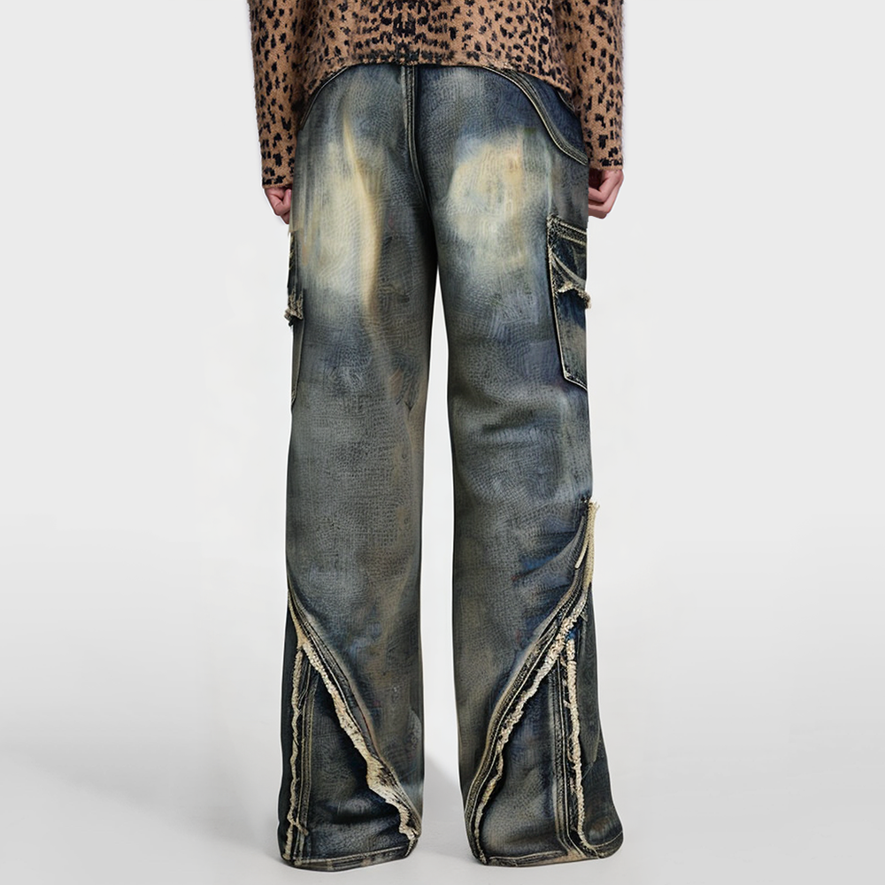 These men's jeans are crafted from a polyester/cotton blend satin fabric, combining comfort and durability for a lightweight, breathable wearing experience. The fabric has a soft texture and is fade-resistant, maintaining its deep washed-out color even after repeated washing. The overall style draws inspiration from retro high-street design, combining a relaxed fit with washed processing and personalized studded accents, embodying a casual yet trendy street-style aesthetic.