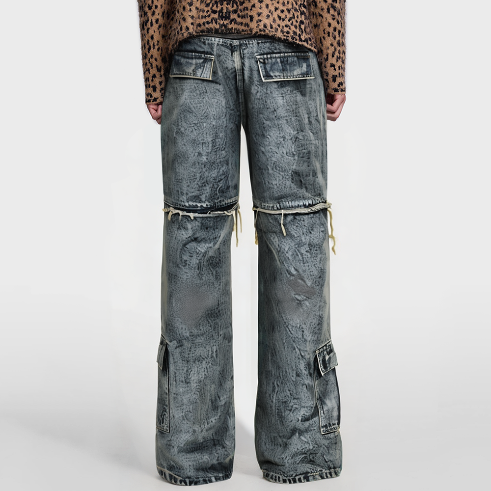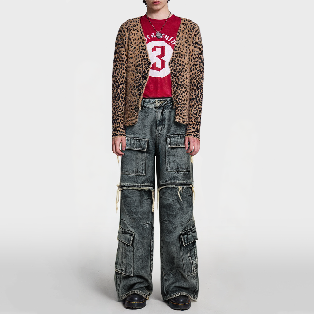 High-street fashion pairing: The combination of prints, washed design, and distressed detailing pairs well with sneakers, skate shoes, or Dr. Martens boots, showcasing a street-style personality.