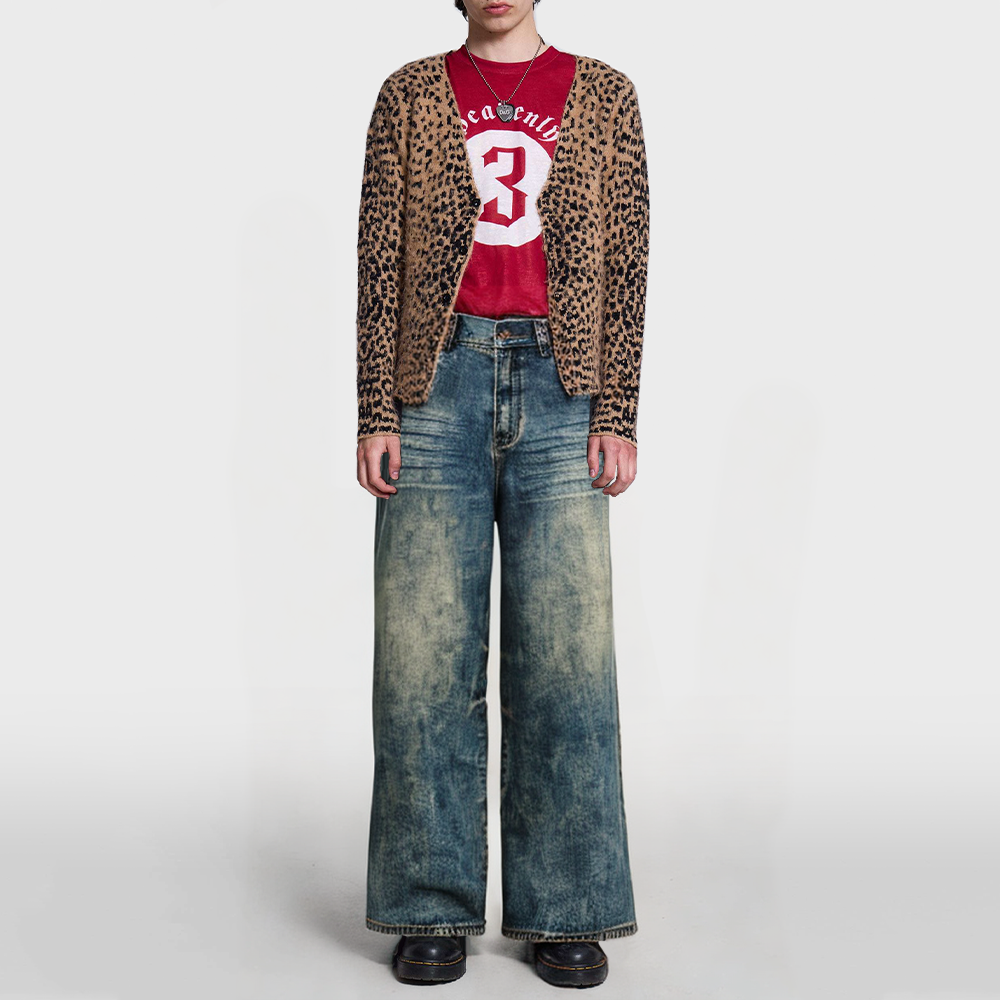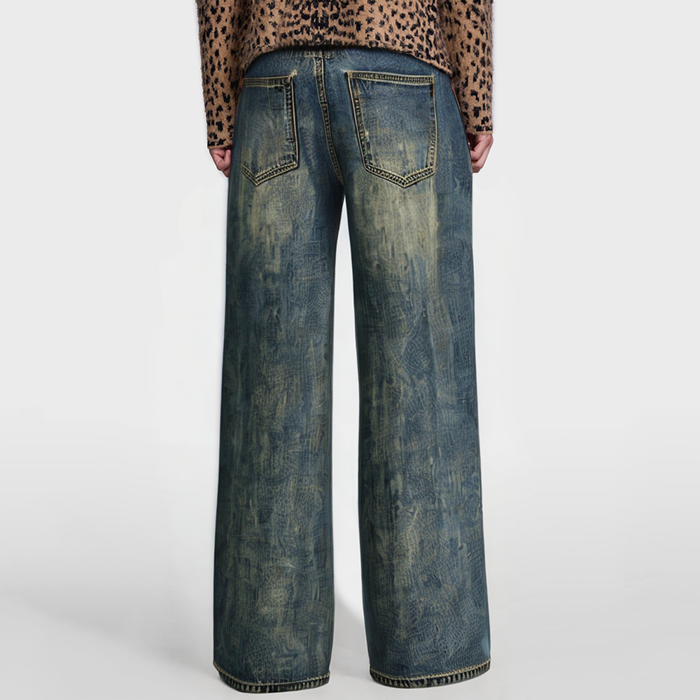 The pant body undergoes a wash and distressed process to create a natural, vintage layered effect and faded appearance, giving the jeans a street-style aesthetic and a lived-in feel. The addition of printed elements breaks the monotony, adding a unique visual highlight to the pants and showcasing a youthful vitality and artistic flair. The hem is adorned with pleated details, adding a touch of elegance to the rugged, vintage aesthetic.
