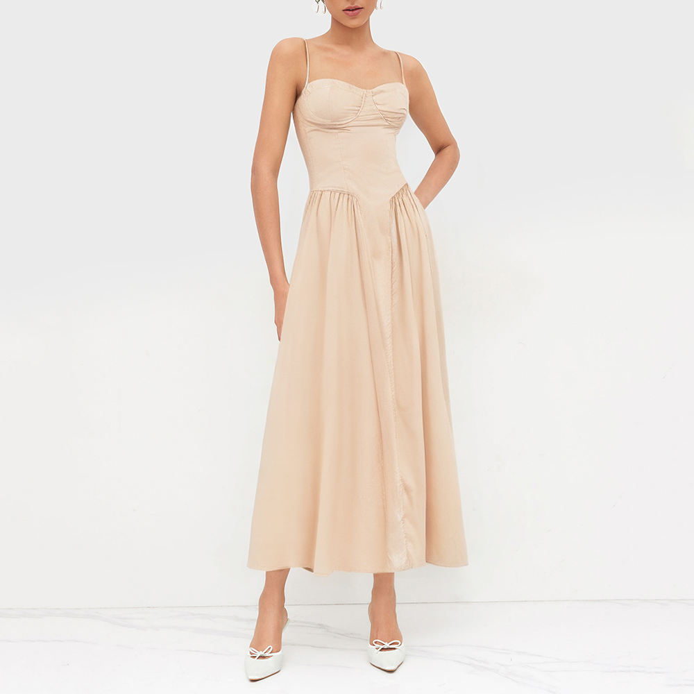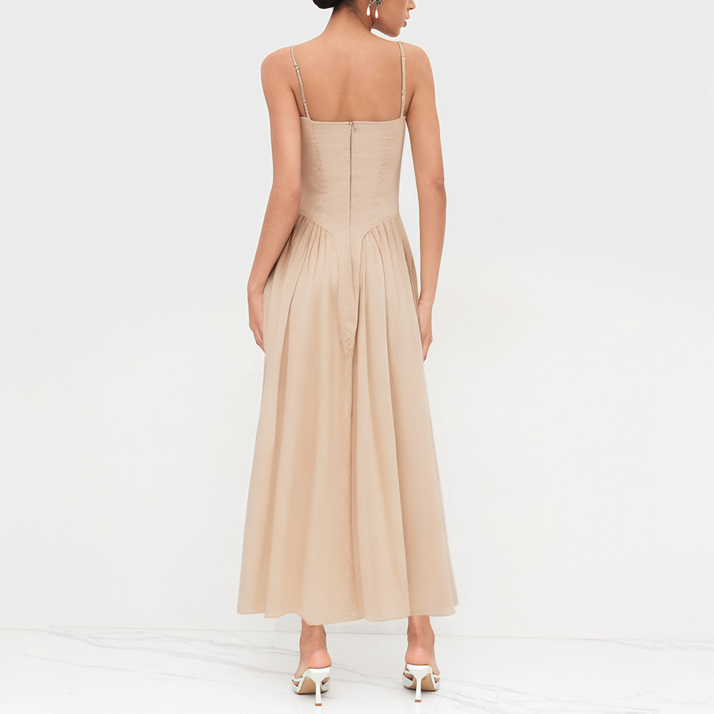 The design highlight is the three-dimensional steel-wire waistband, which perfectly supports the waistline, creates a slender silhouette, and highlights the woman's elegant posture. The skirt features pleated design and ruffled trim, creating a natural flowing effect when walking, adding layers and dynamic beauty. The square neckline and sleeveless cut highlight the shoulder and neckline, adding a fresh and refined touch.