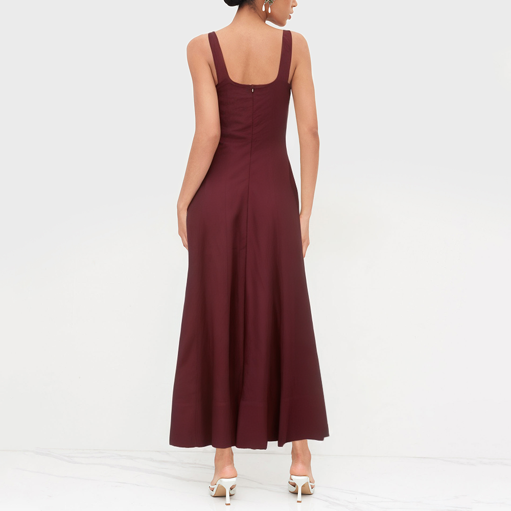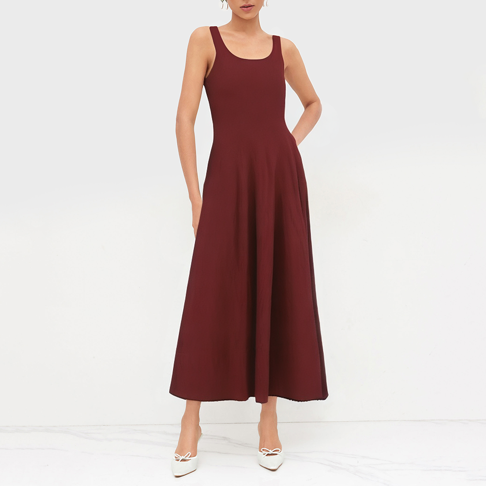 The design highlights include a square neckline and sleeveless cut, naturally highlighting the shoulder and neckline while accentuating the arm contours, creating a fresh and elegant visual effect. The dress features a loose, flowing design with a smooth, flowing hem, enhancing the overall sense of movement and elegance. The hidden zipper design makes it easy to put on and take off while maintaining the dress's clean silhouette.